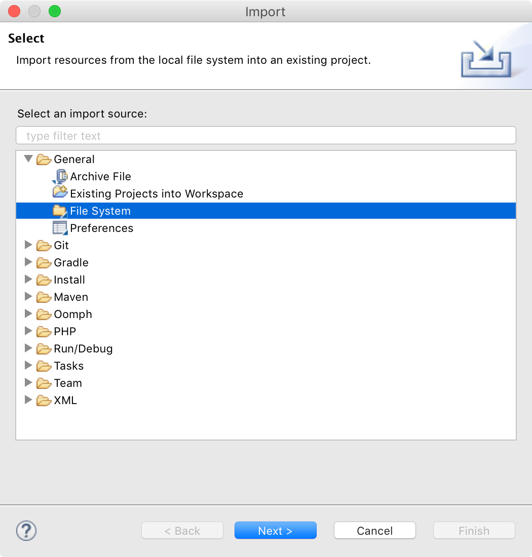 Steht ein entsprechendes Projekt zur Verfügung, öffnen Sie in Eclipse den Importdialog über File -> Import, wählen Sie unter der der Kategorie General den Punkt File System aus und klicken Sie auf Next >.