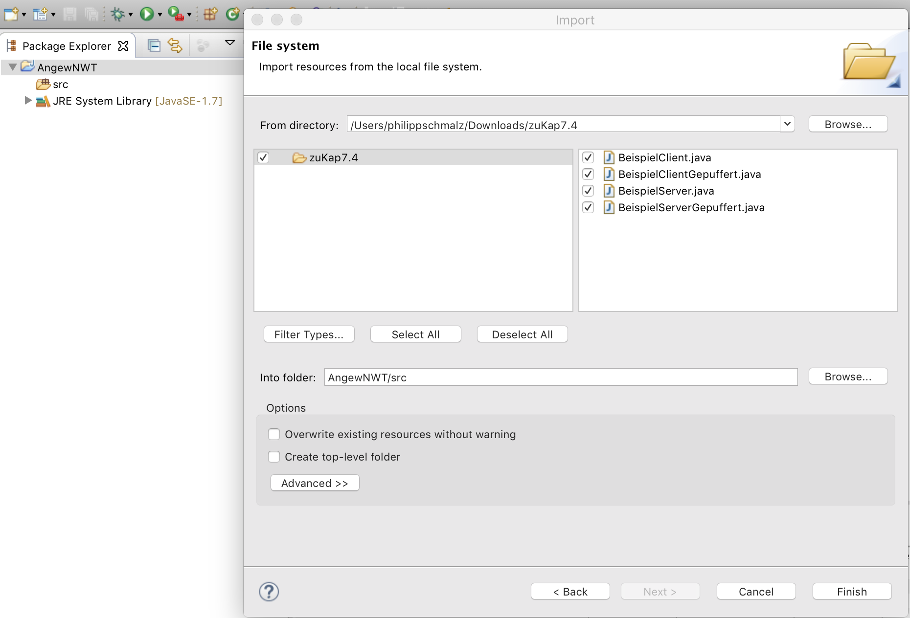 Klicken Sie auf Finish. Die Quellcodes sind nun erfolgreich in Eclipse importiert und können verwendet werden.